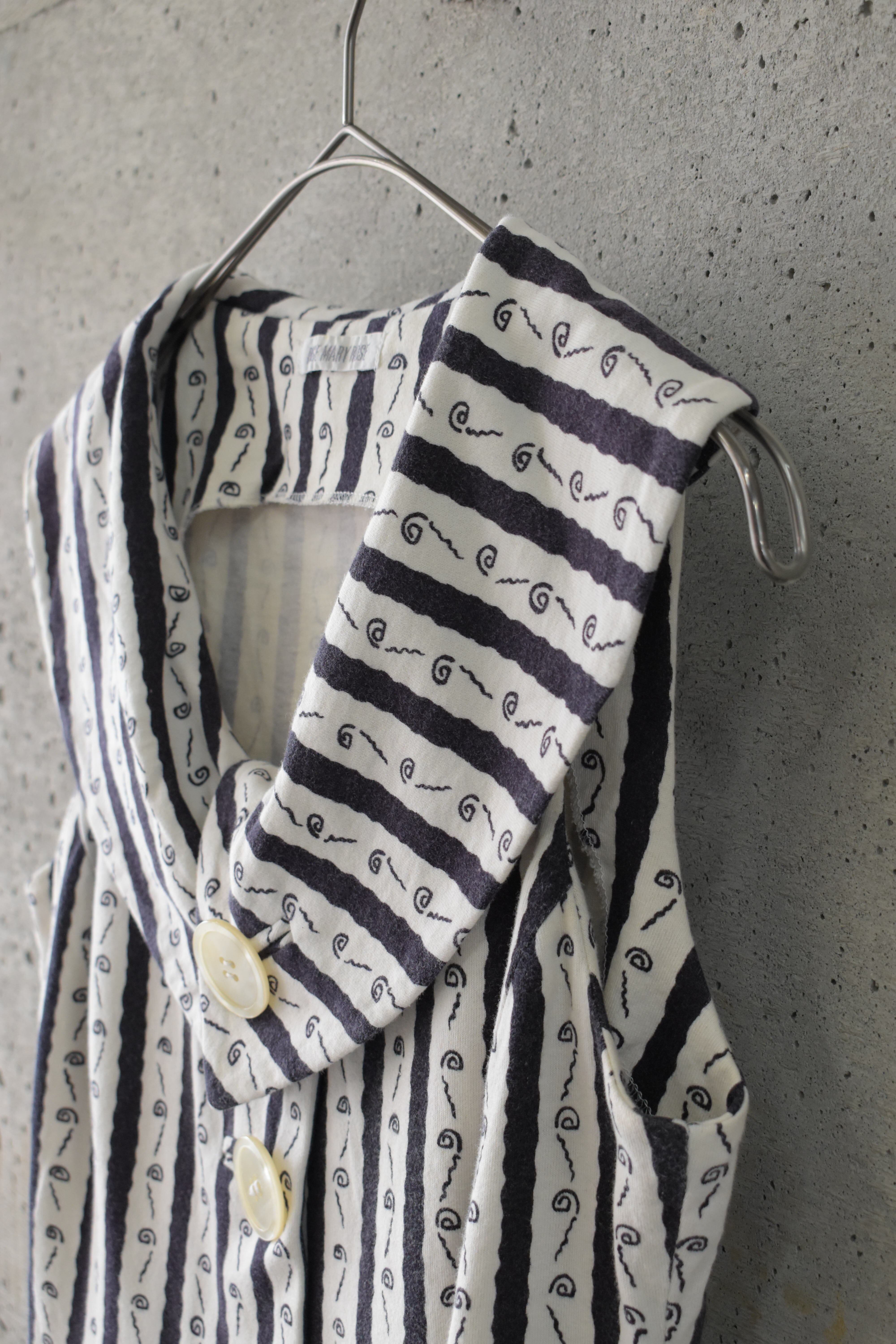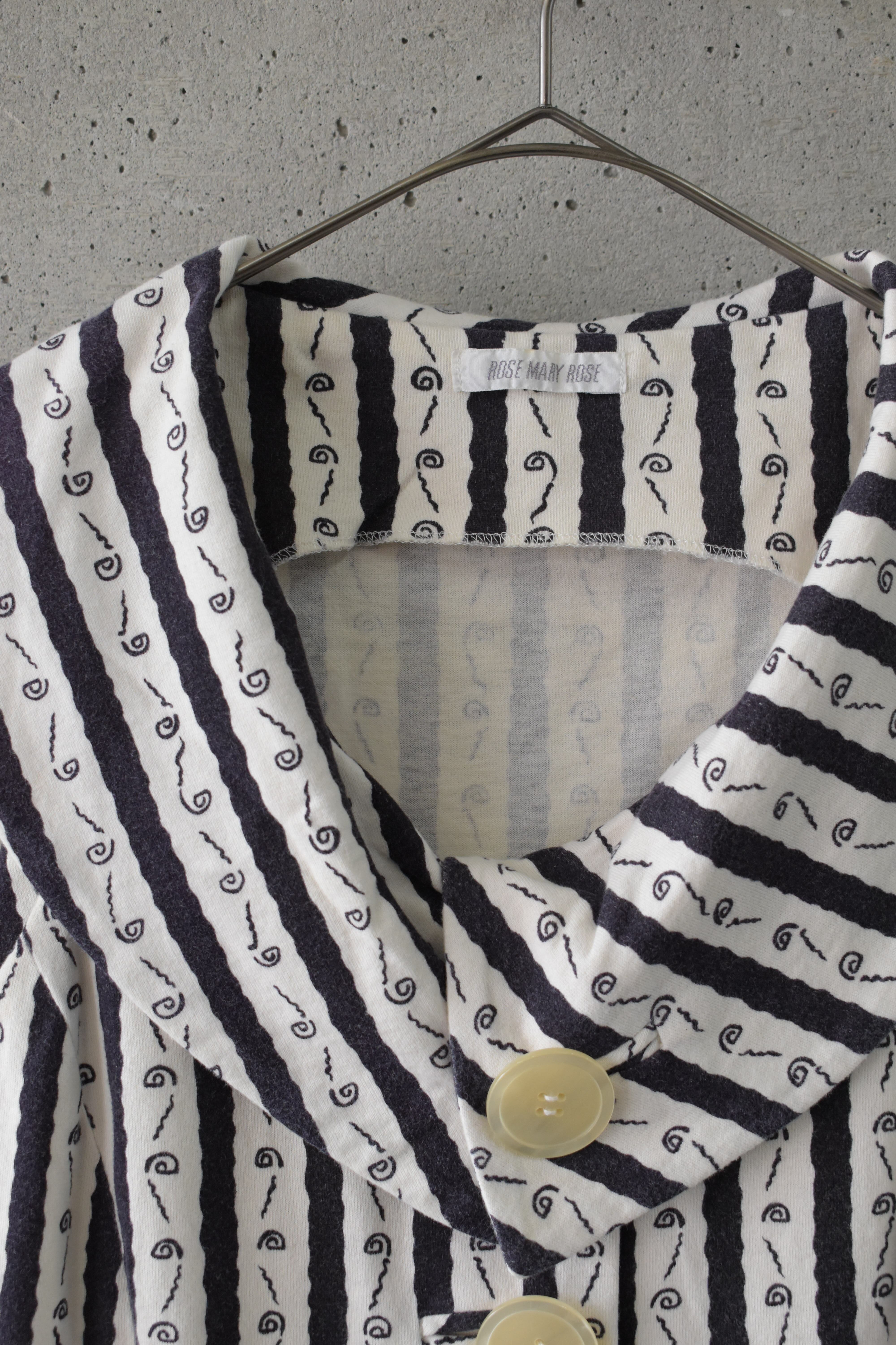 ストライプにさりげなく混ざる遊びのある柄が、シンプルに収まらない1着です。