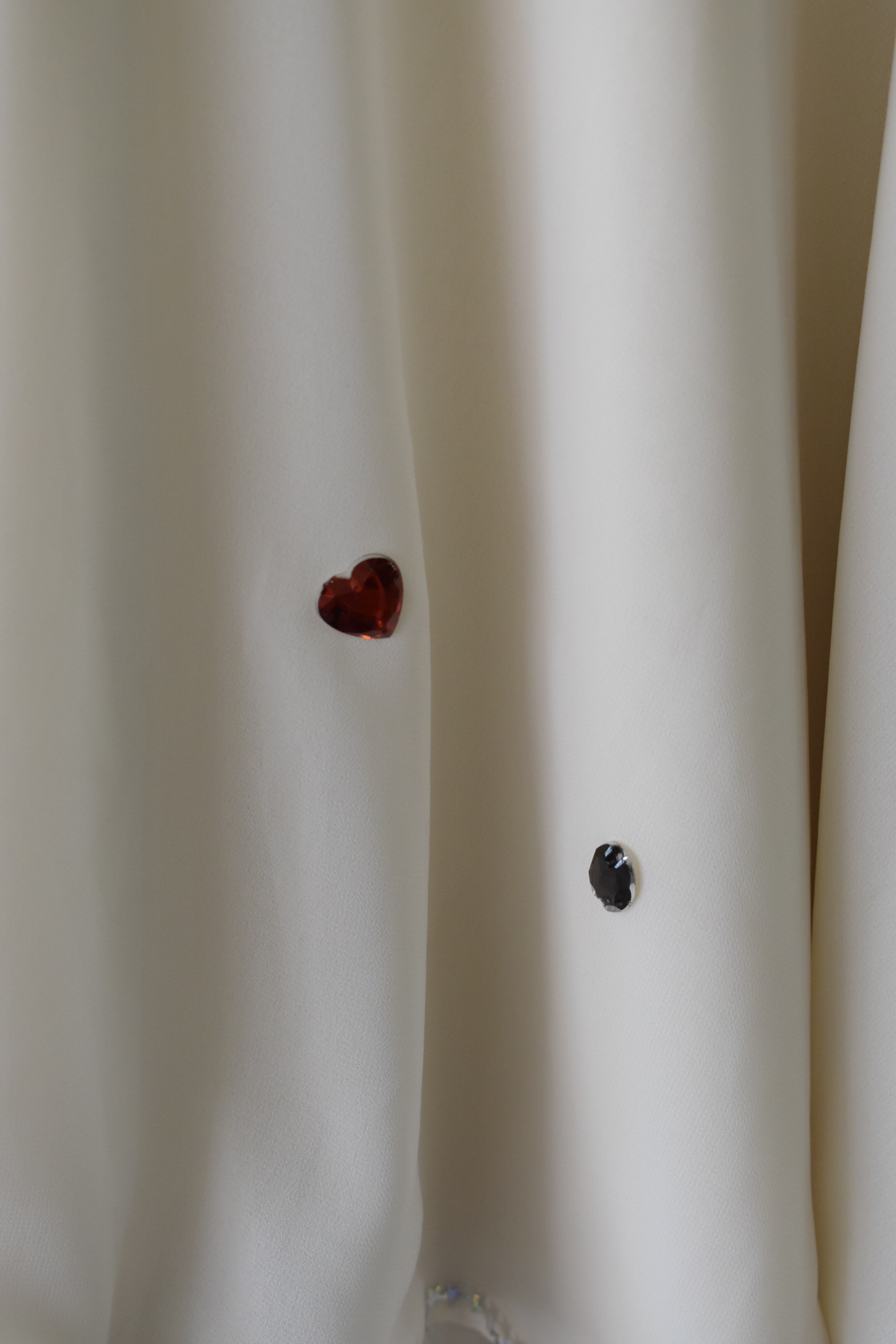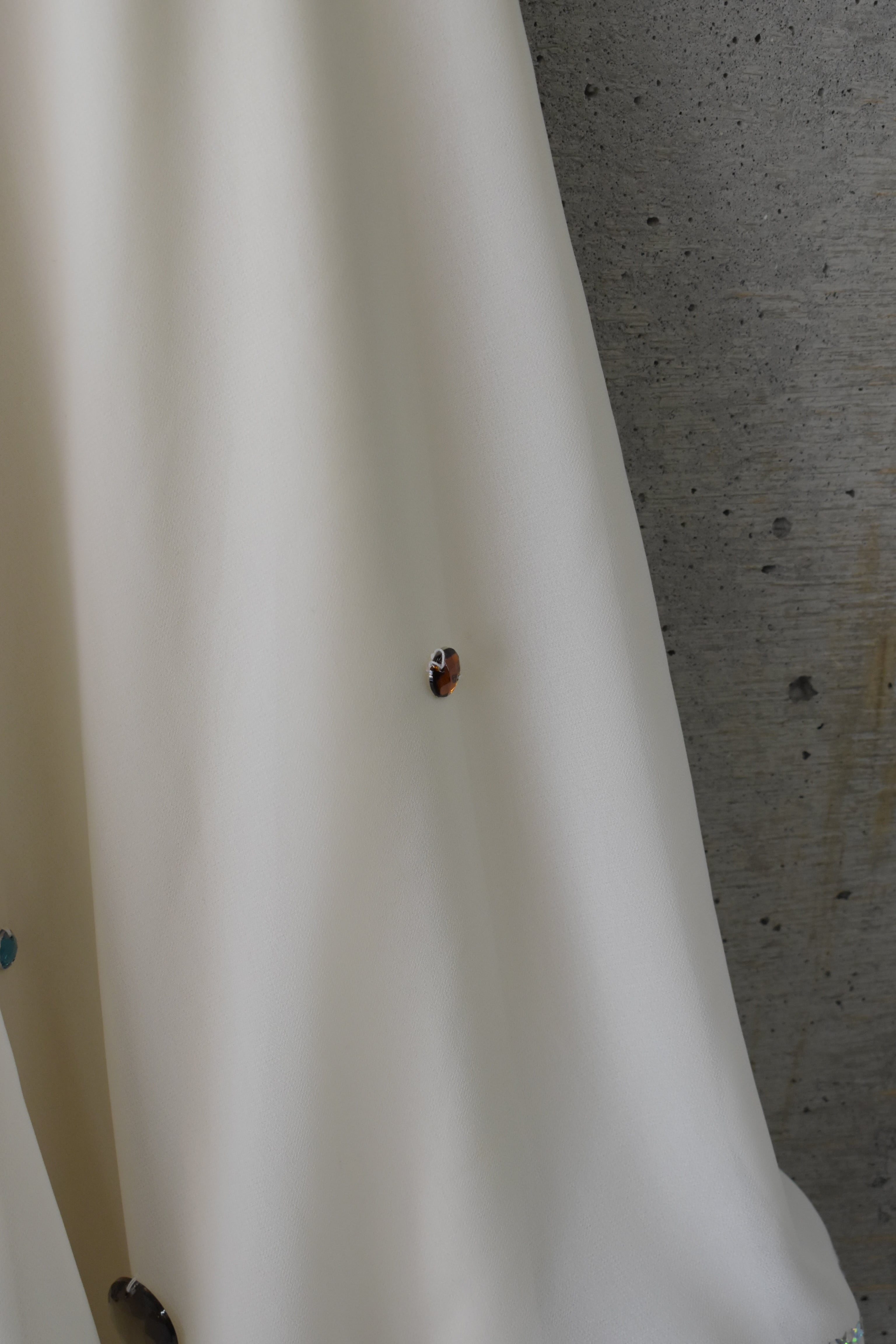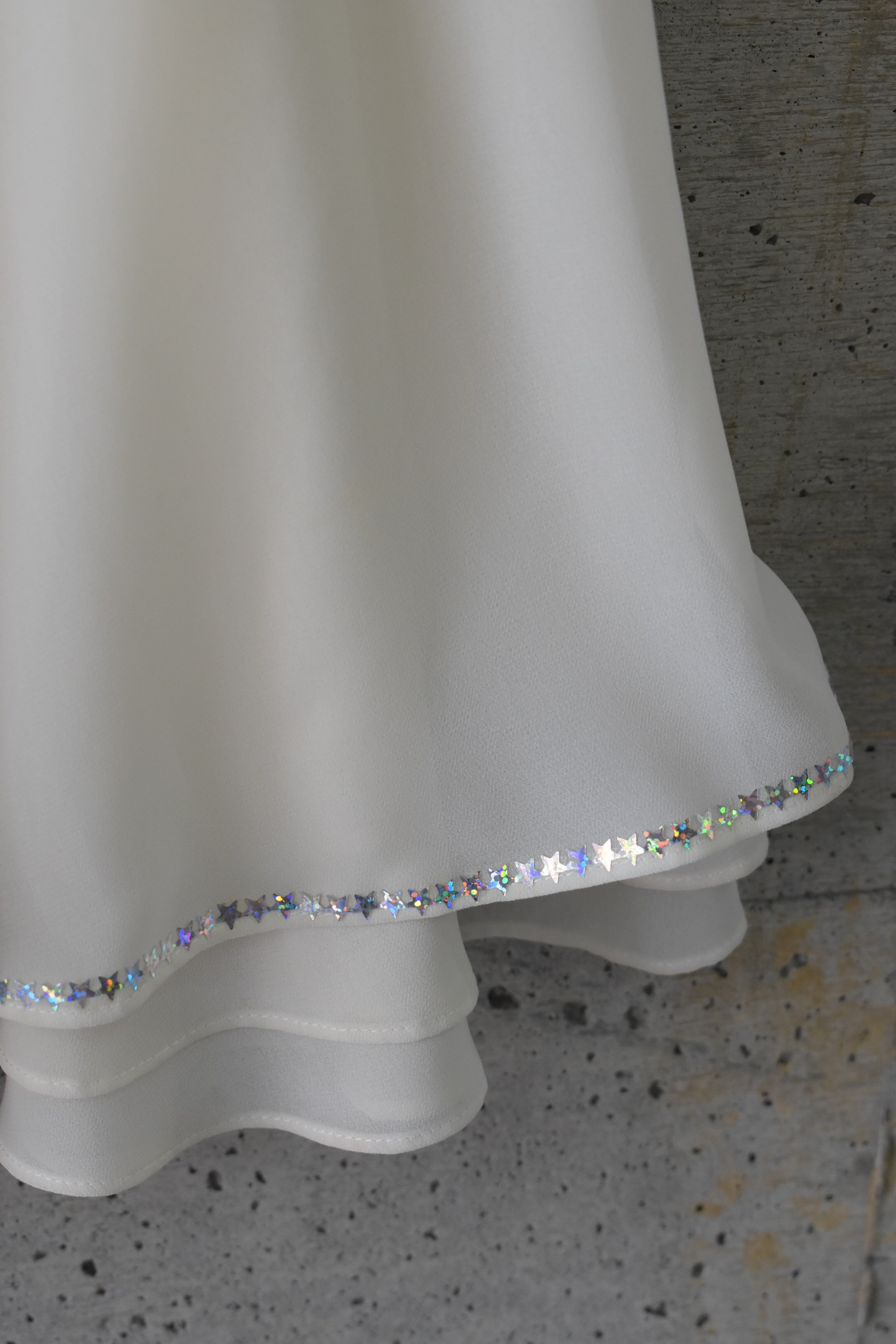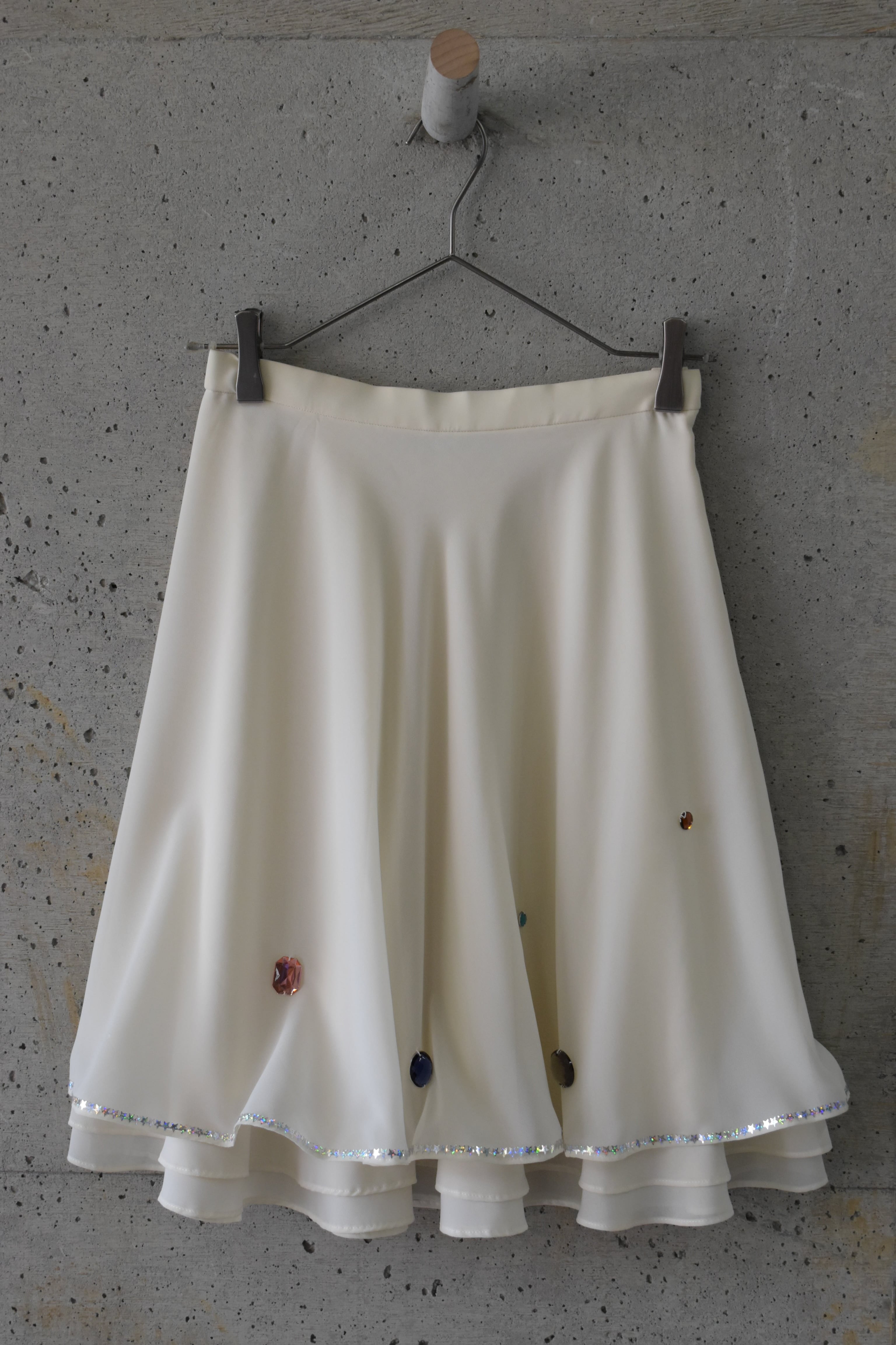 裾が3段になっているので、丈は短いですがボリュームがあることで下半身にも目がいくようになり、よりストーンやラメの存在感が増すようになっています。