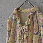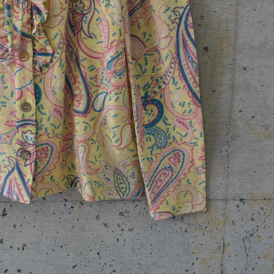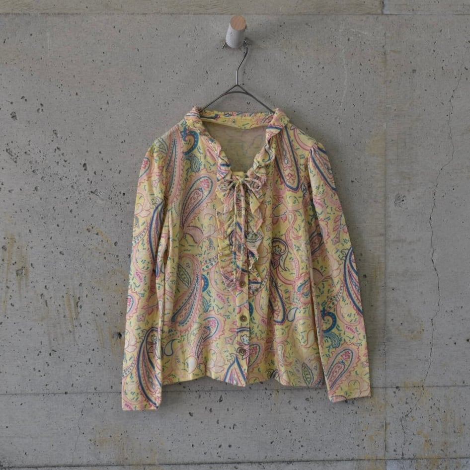 大柄のペイズリーが目を引きますが、落ち着いた色調でやわらかな印象のフリルリボンブラウスです。