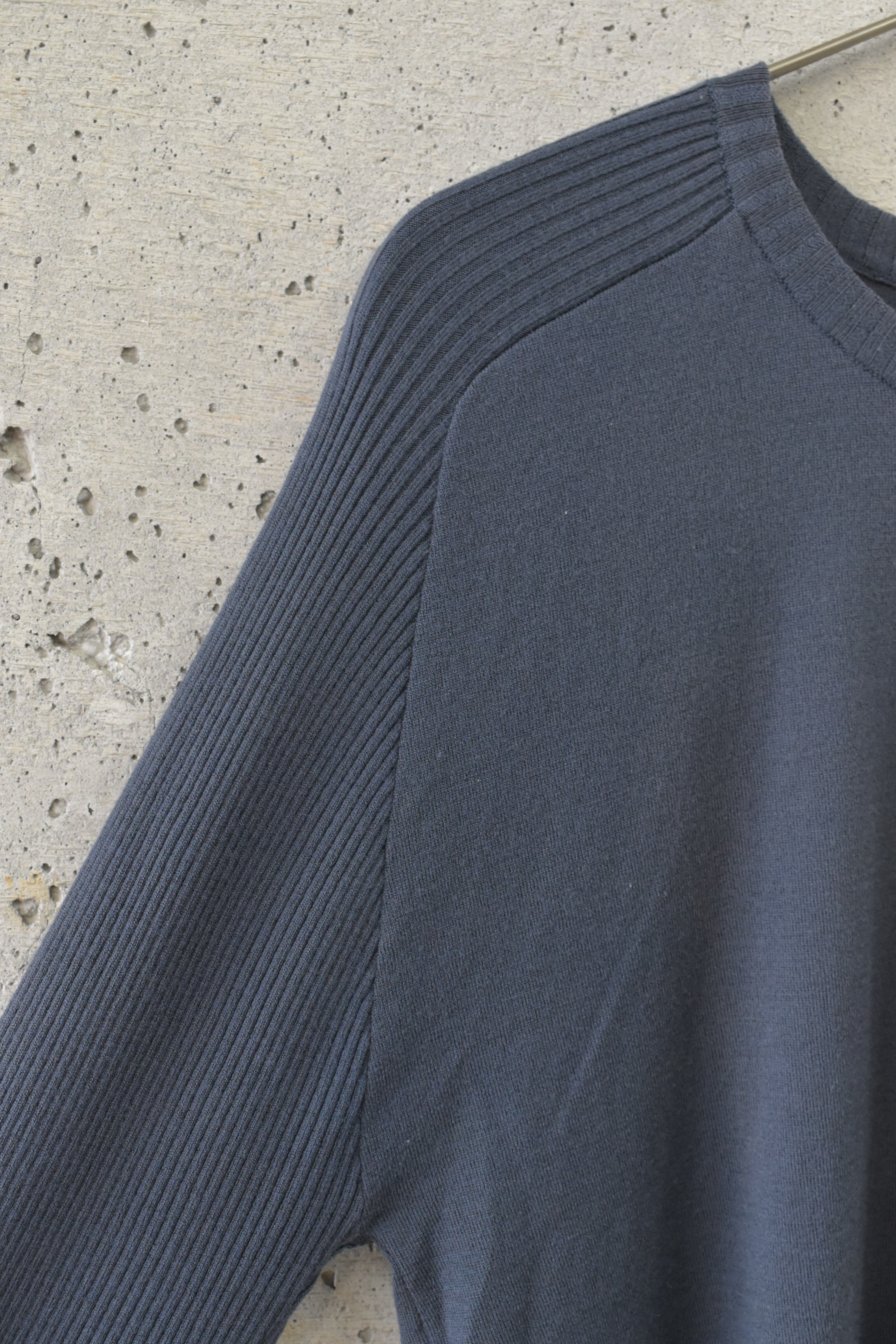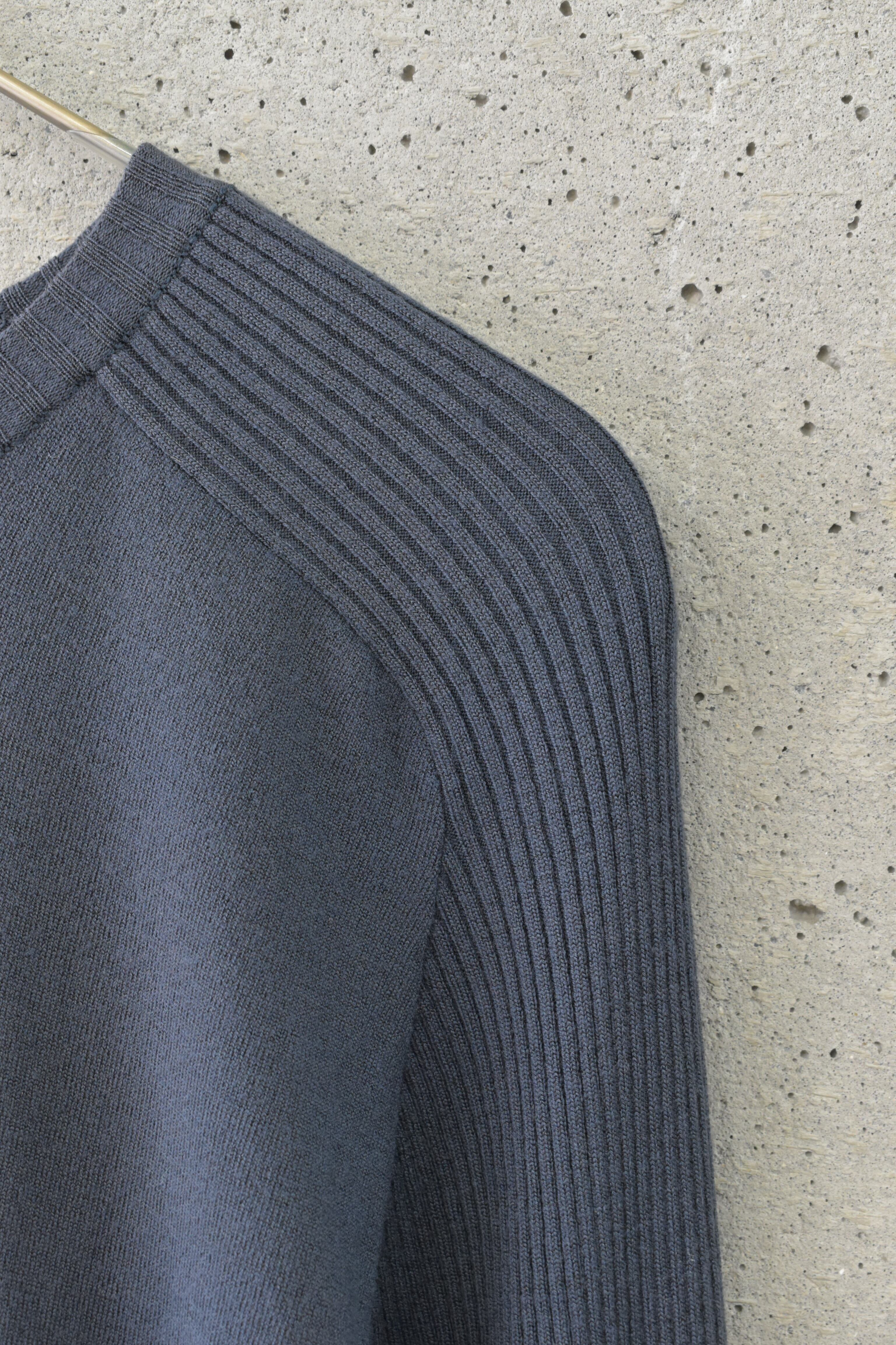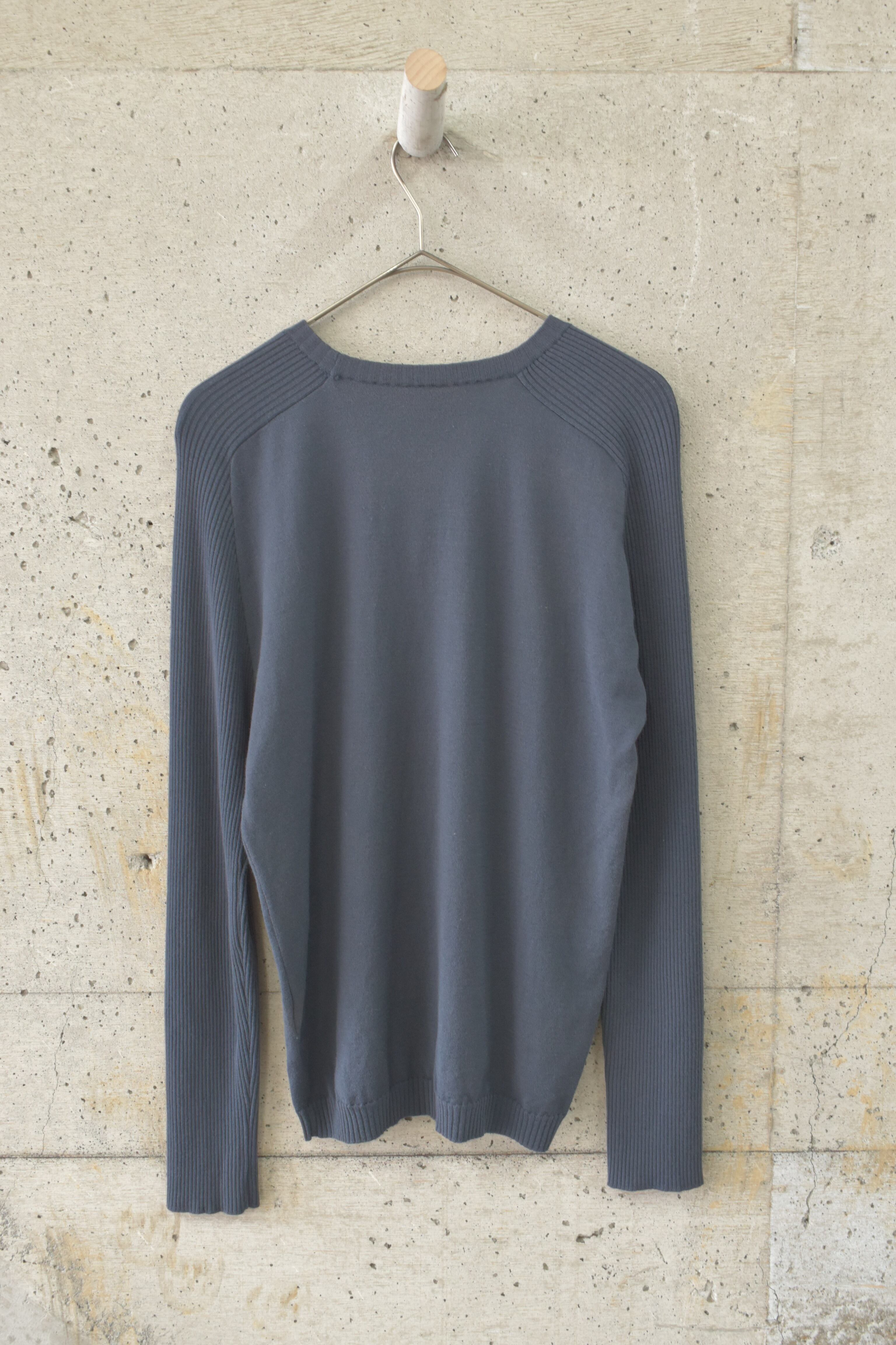 とてもシンプルなデザインですが袖部分は全体がリブニットになっていてラグランのデザインが際立ち、落ち着いた雰囲気の中に遊び心があります。