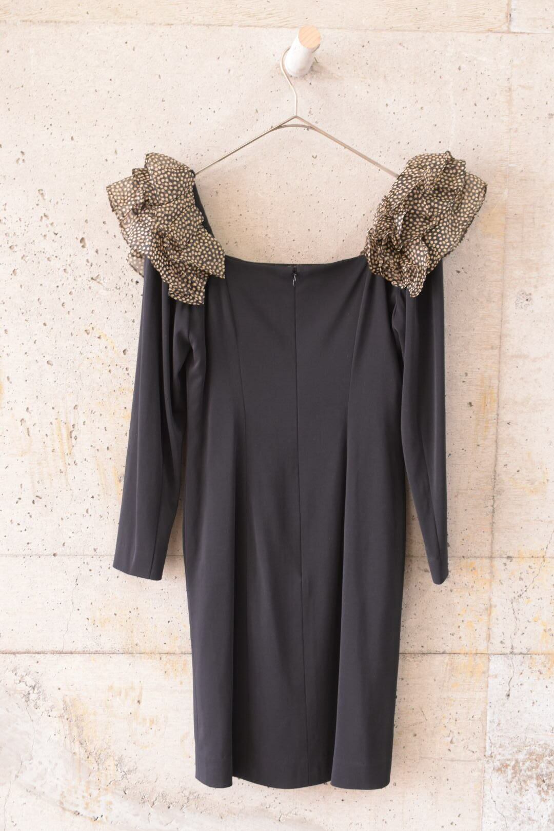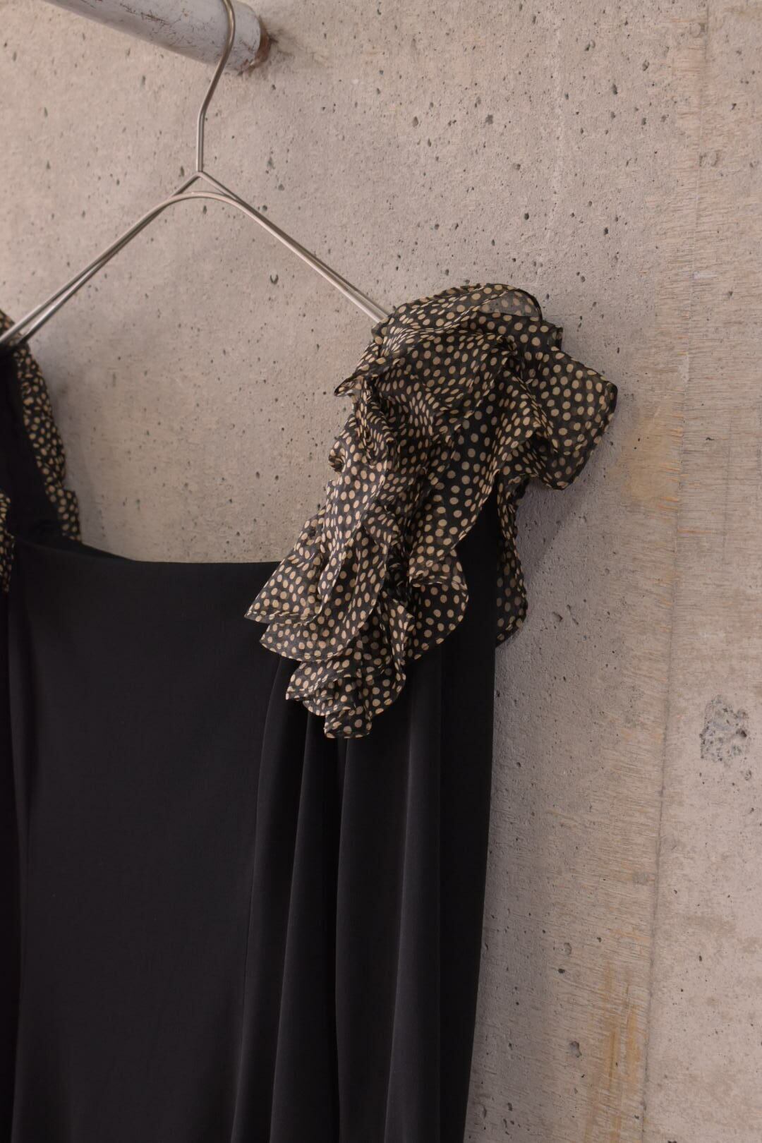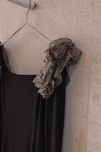 シルク素材に、肩のチュールフリルが華やかなワンピースです。