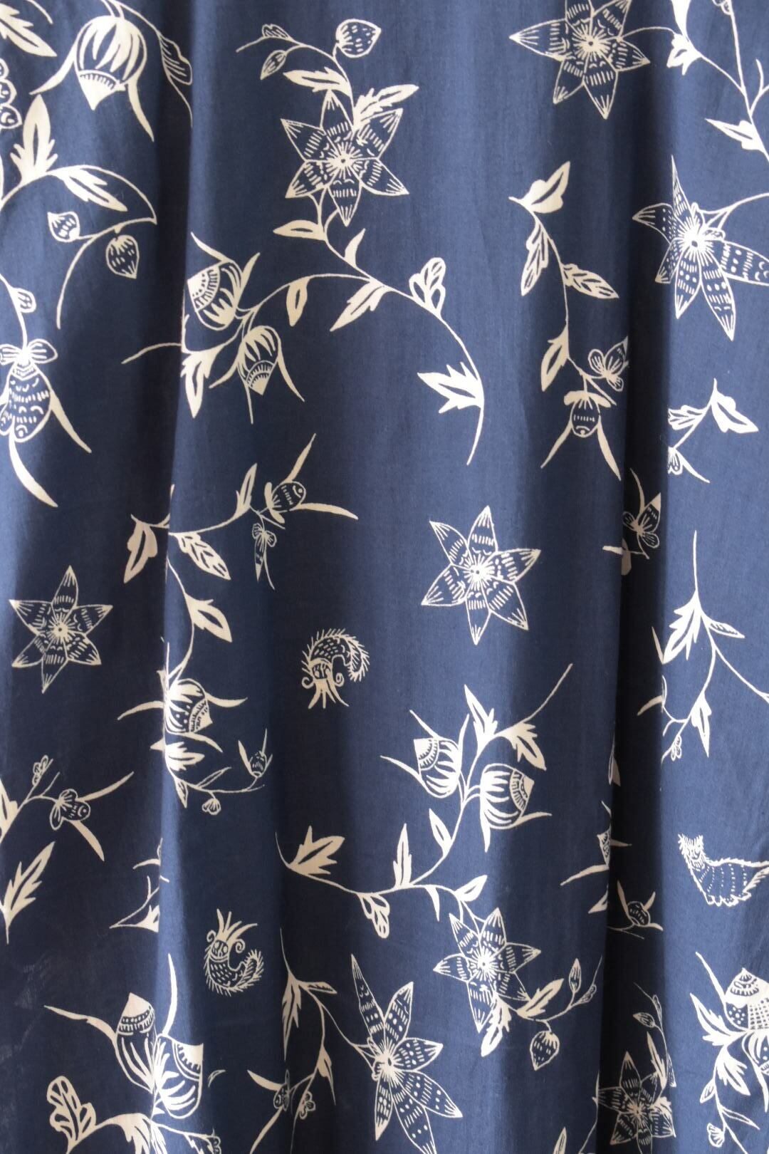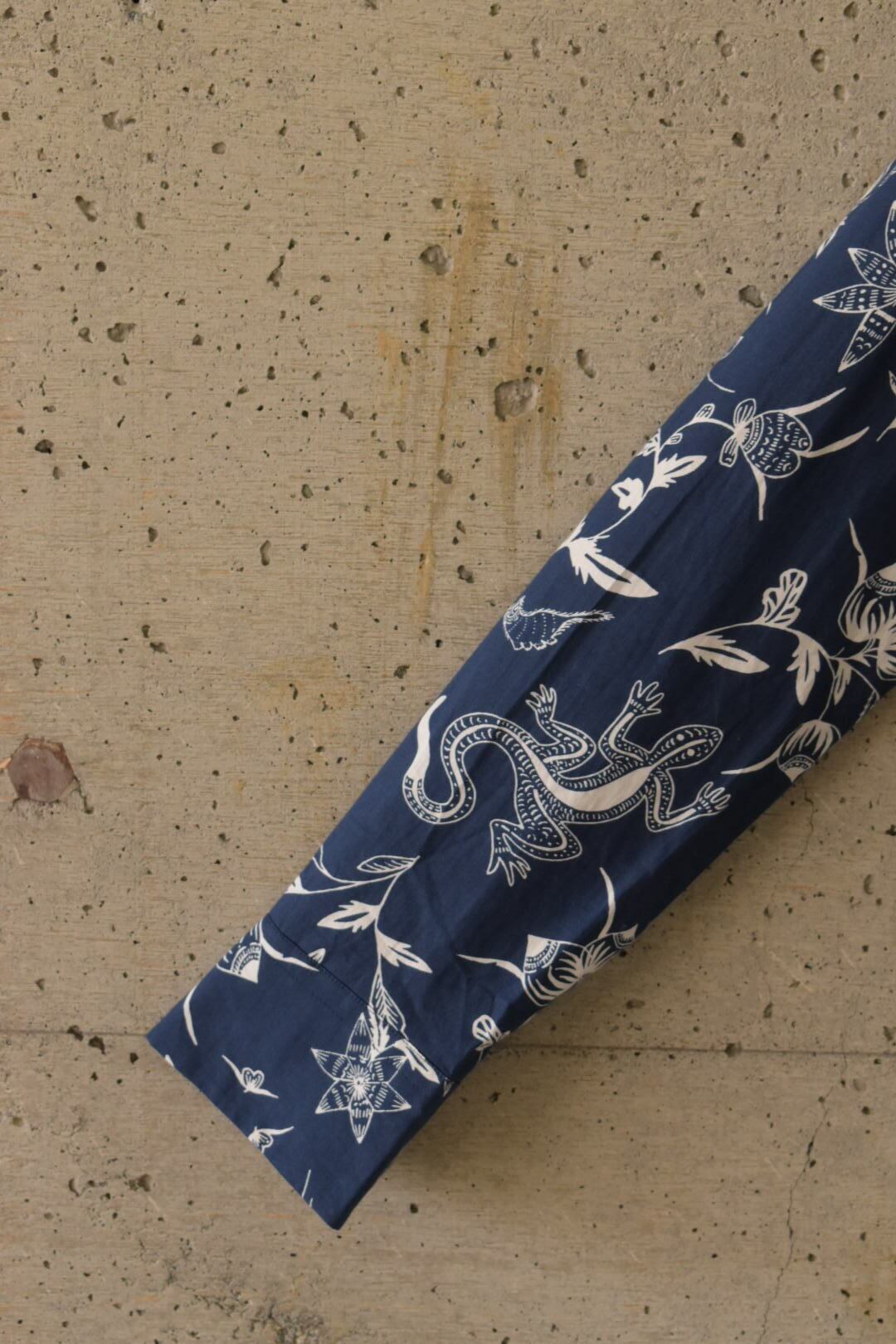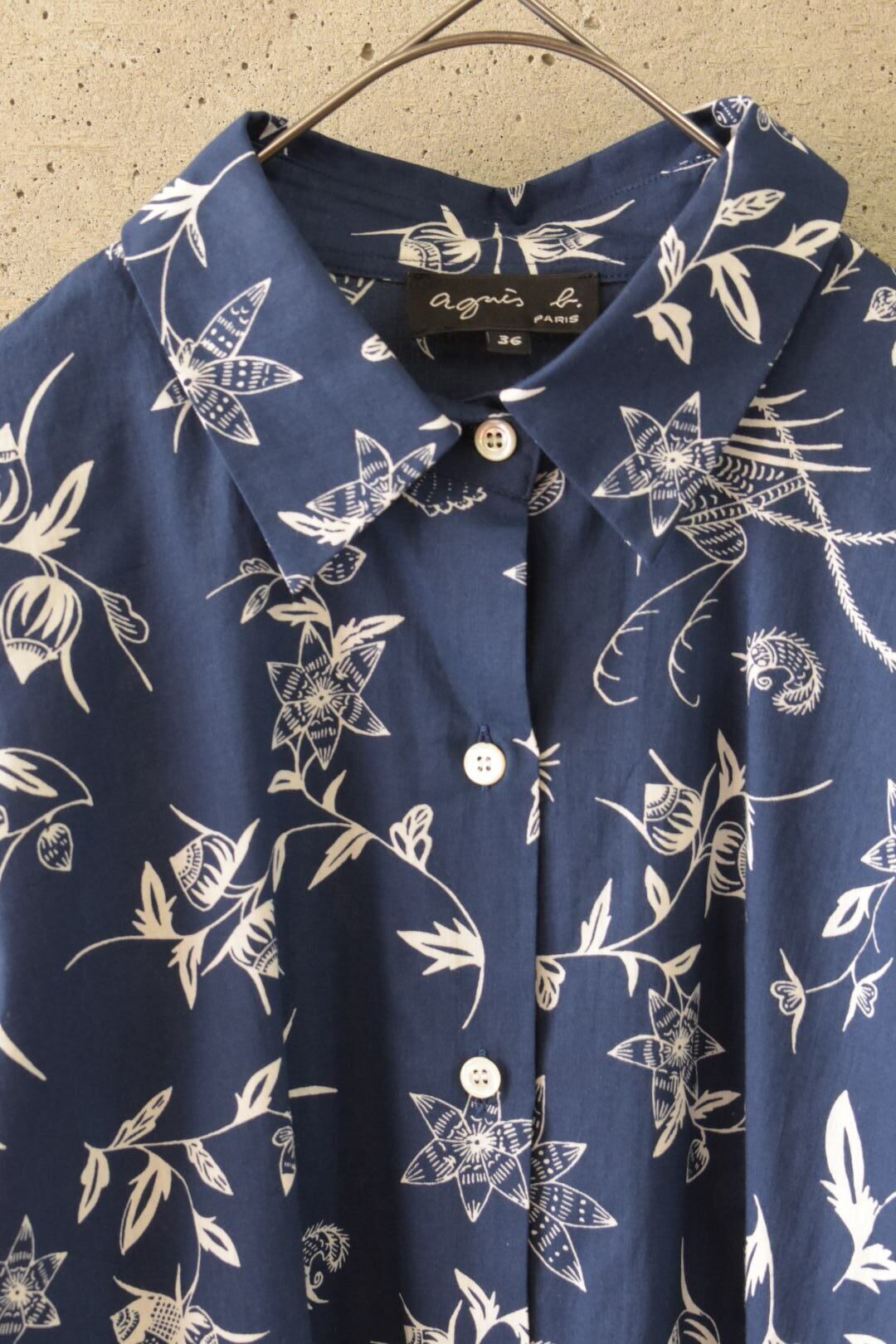 ネイビーにホワイトの柄が入っている薄手のシャツブラウスです。