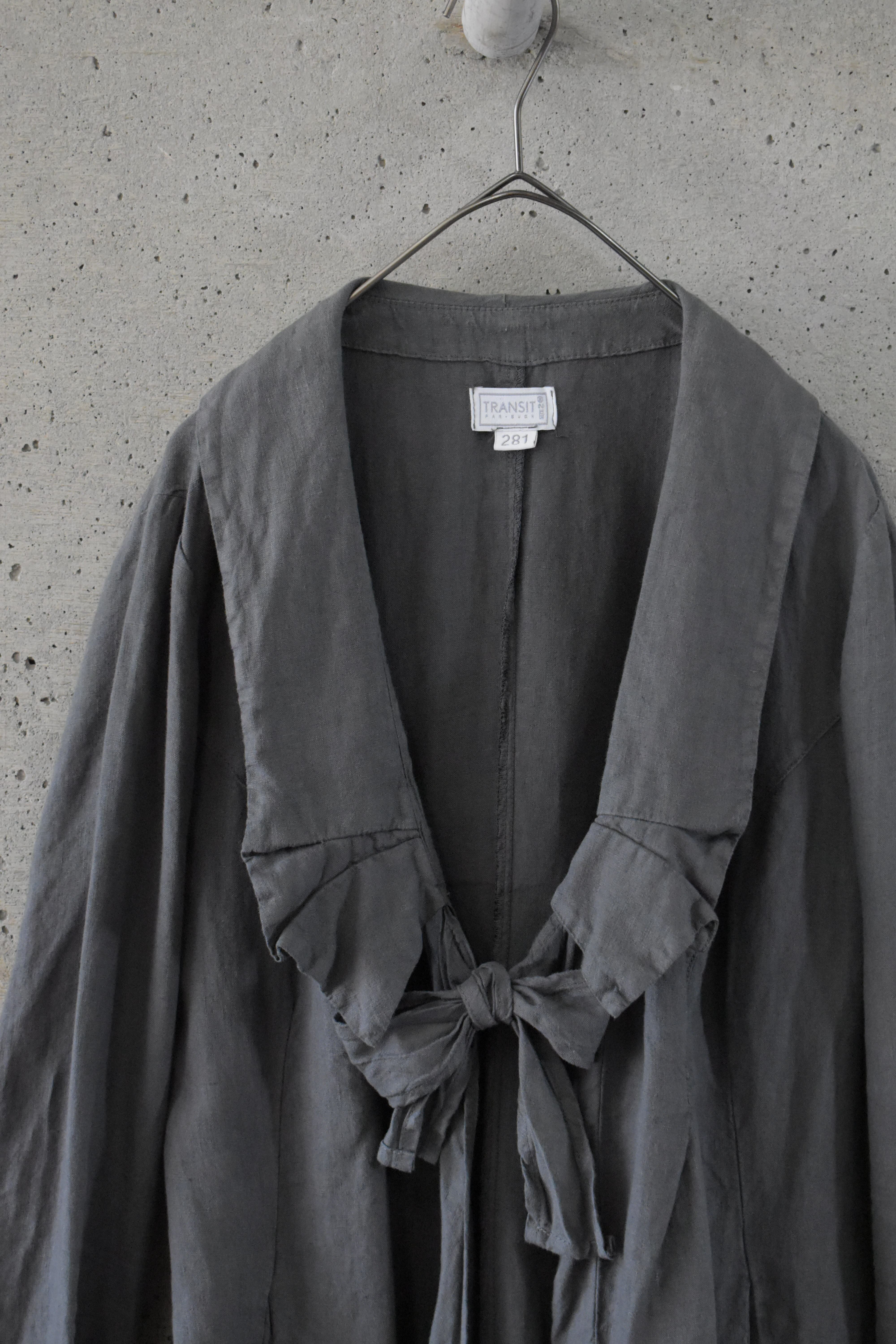 襟の形と、前で結ぶリボンが印象的なジャケットです。