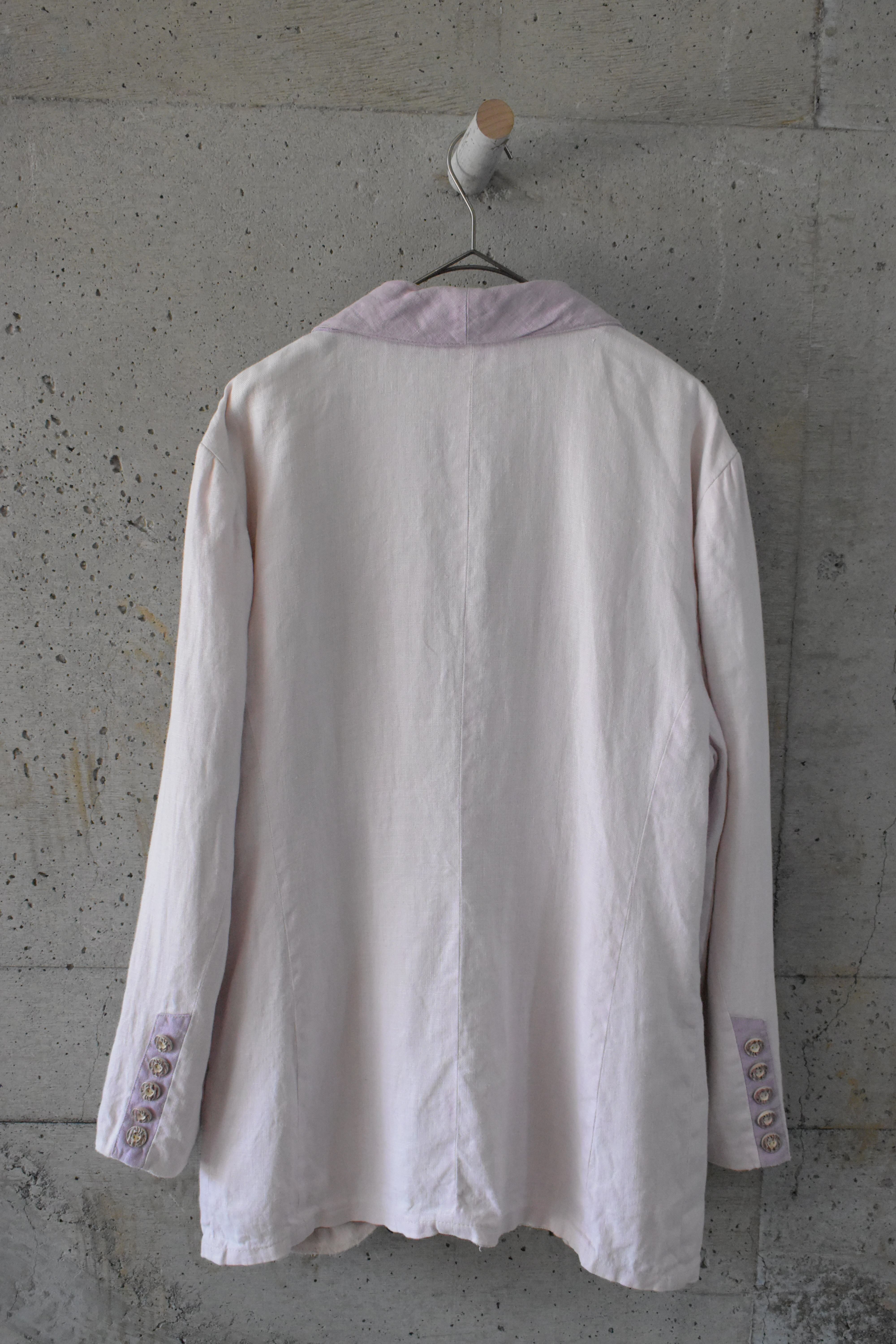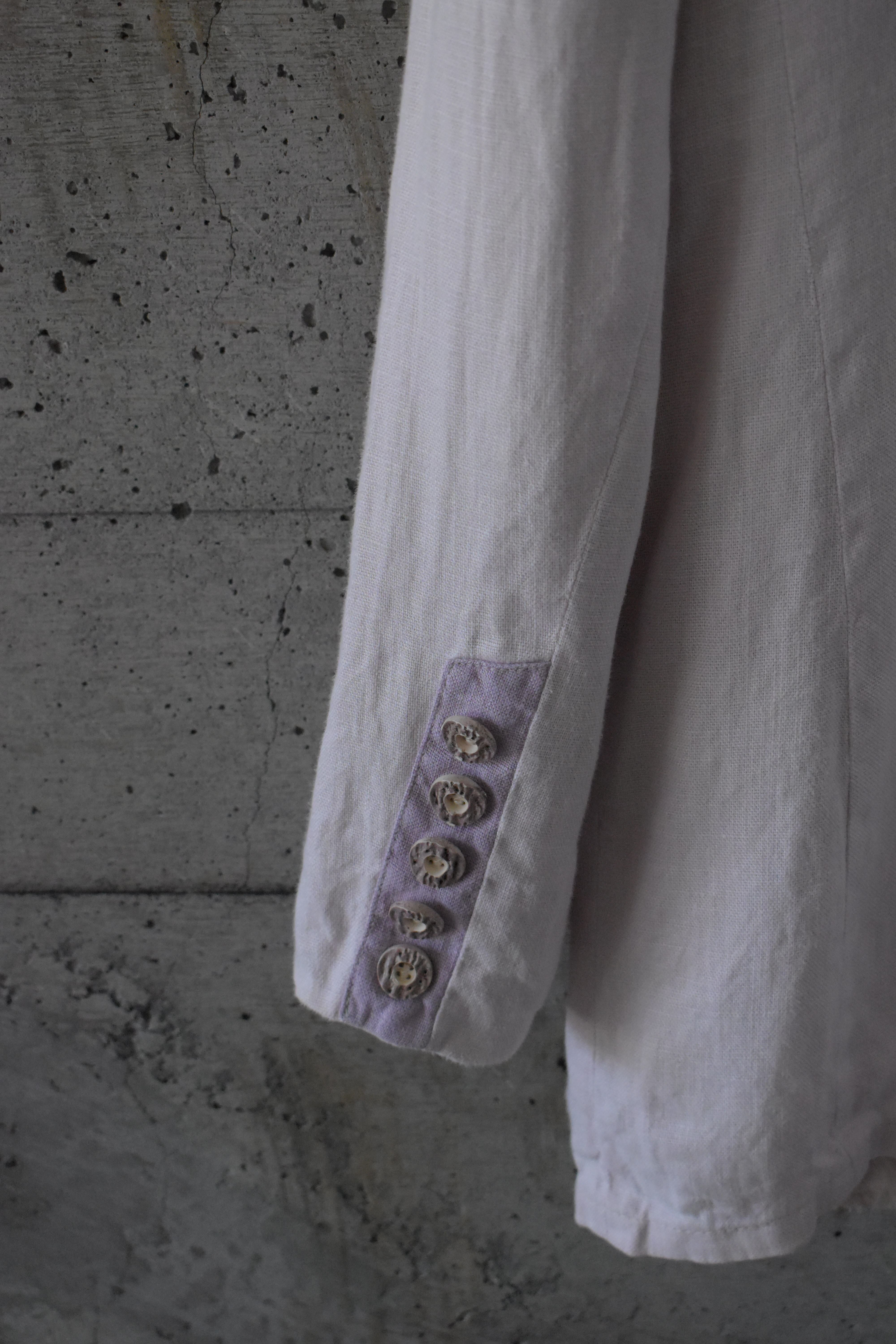 袖口や襟元には淡いパープルの切り替えが入り、並んだ装飾的なボタンとともにさりげないアクセントになっています。