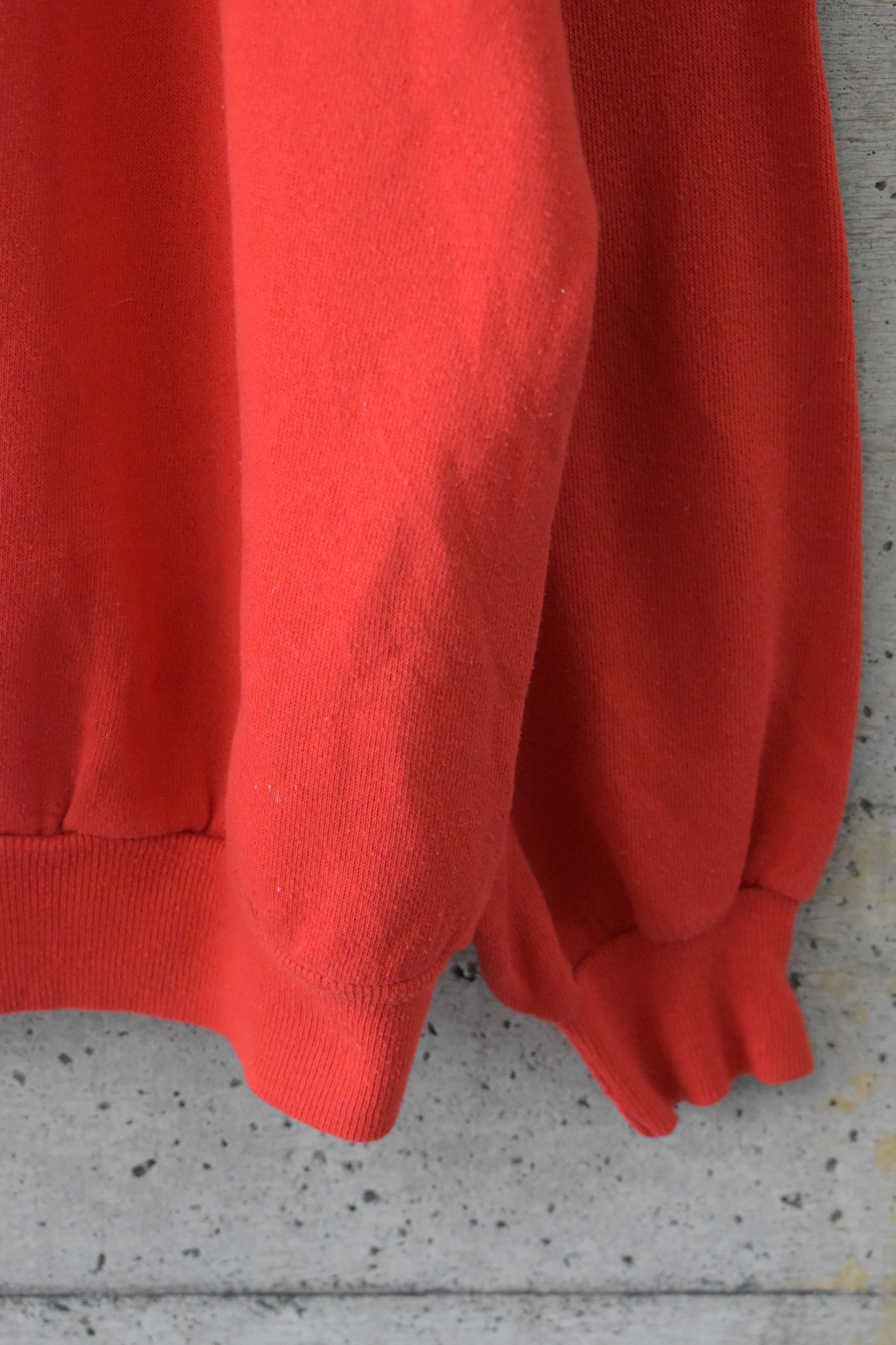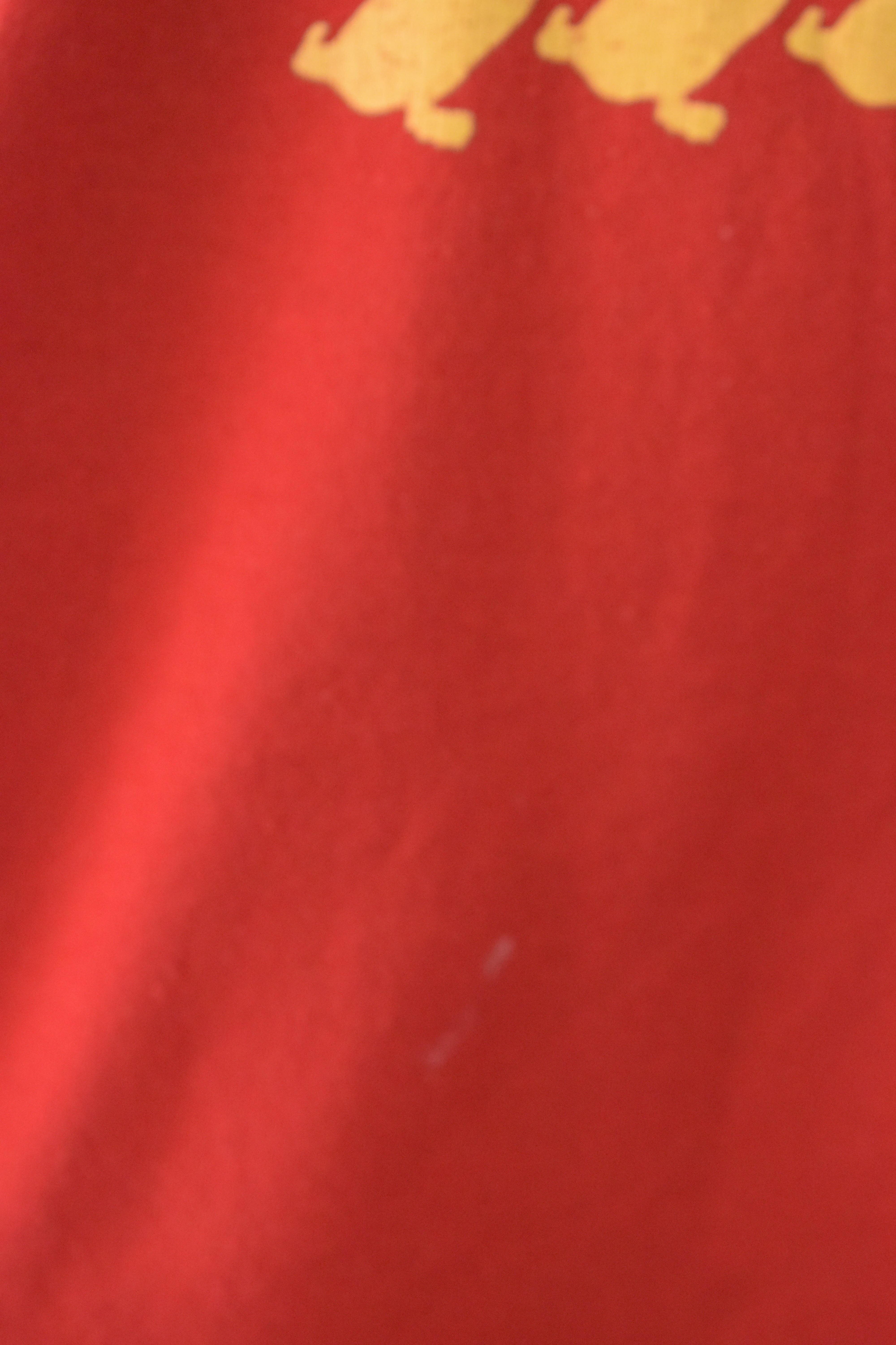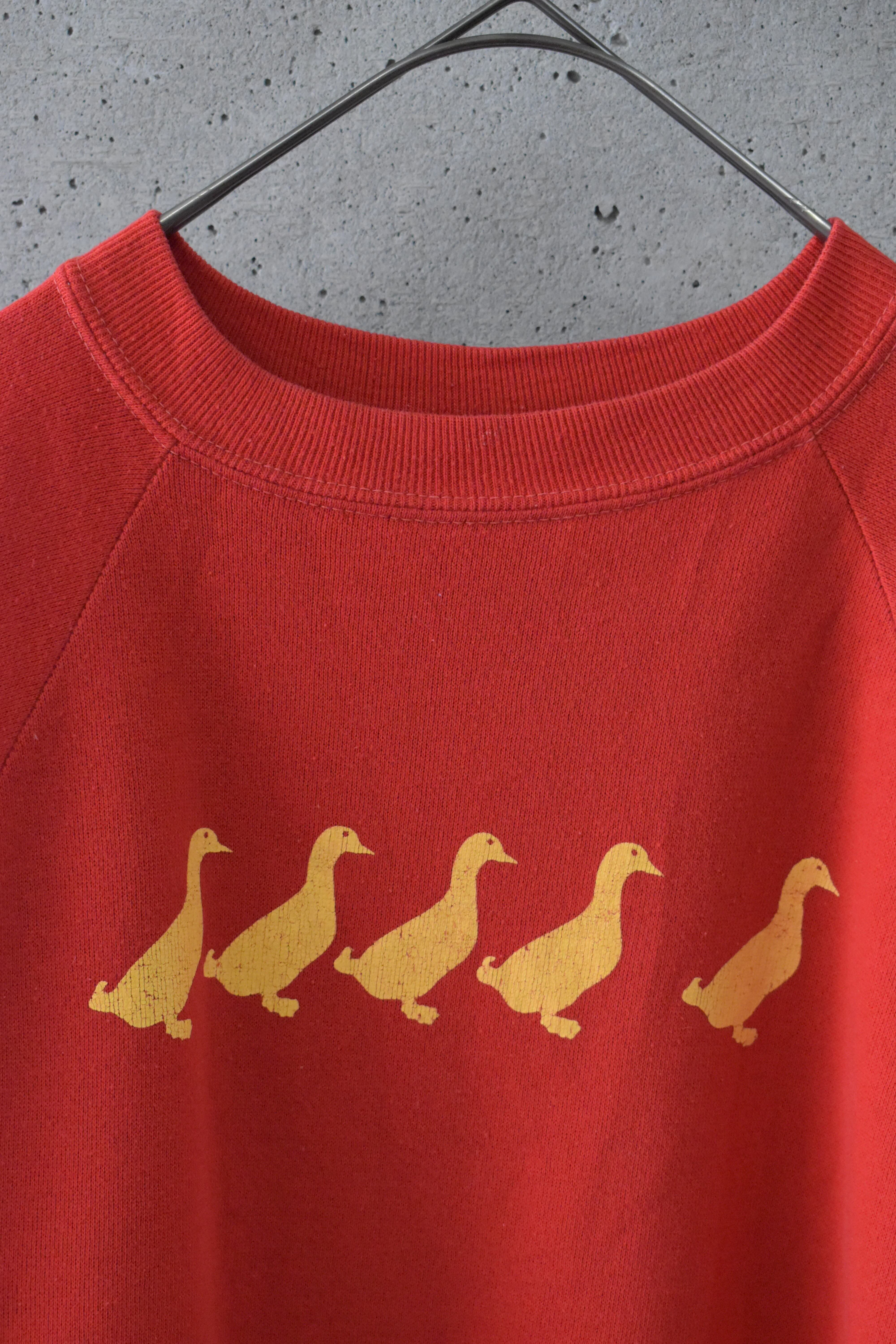 発色の良い赤いボディに、ゴールドのアヒルが並ぶスウェットです。