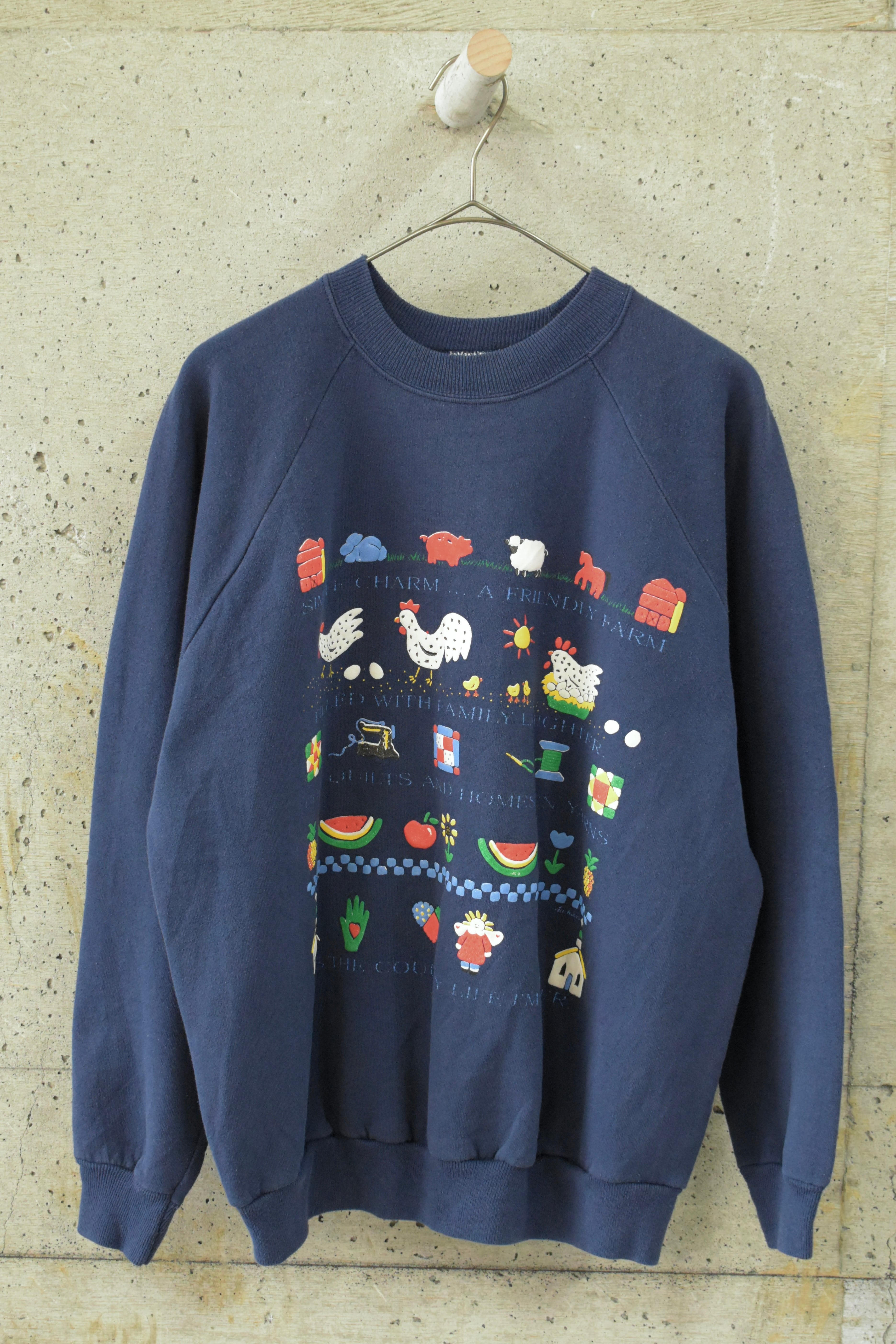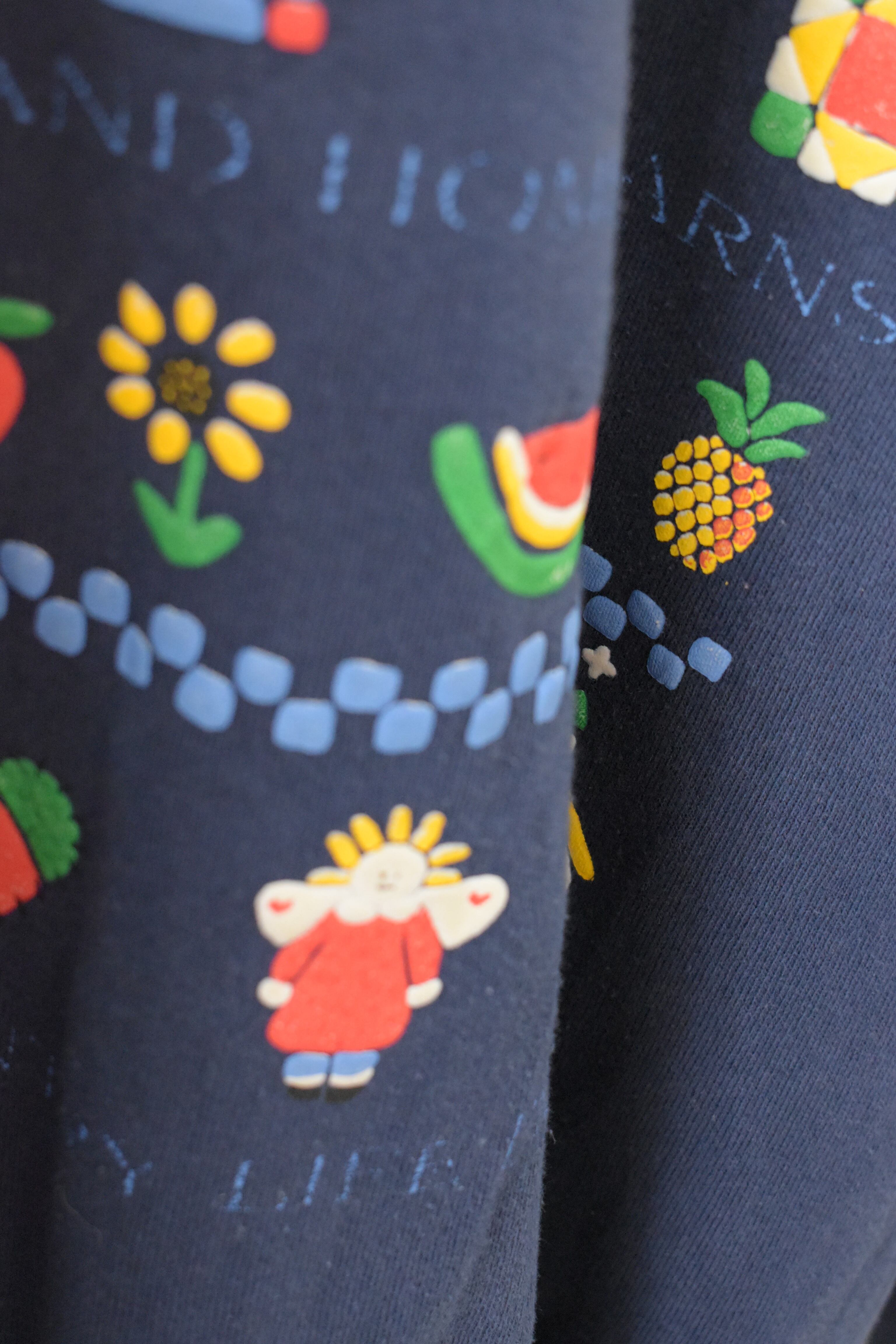 鶏やスイカ、お裁縫道具に天使さまなど可愛らしいモチーフが使われていてぱっと見はスタンダードなスウェットですが、柔らかく、ガーリーな印象を与えてくれます。