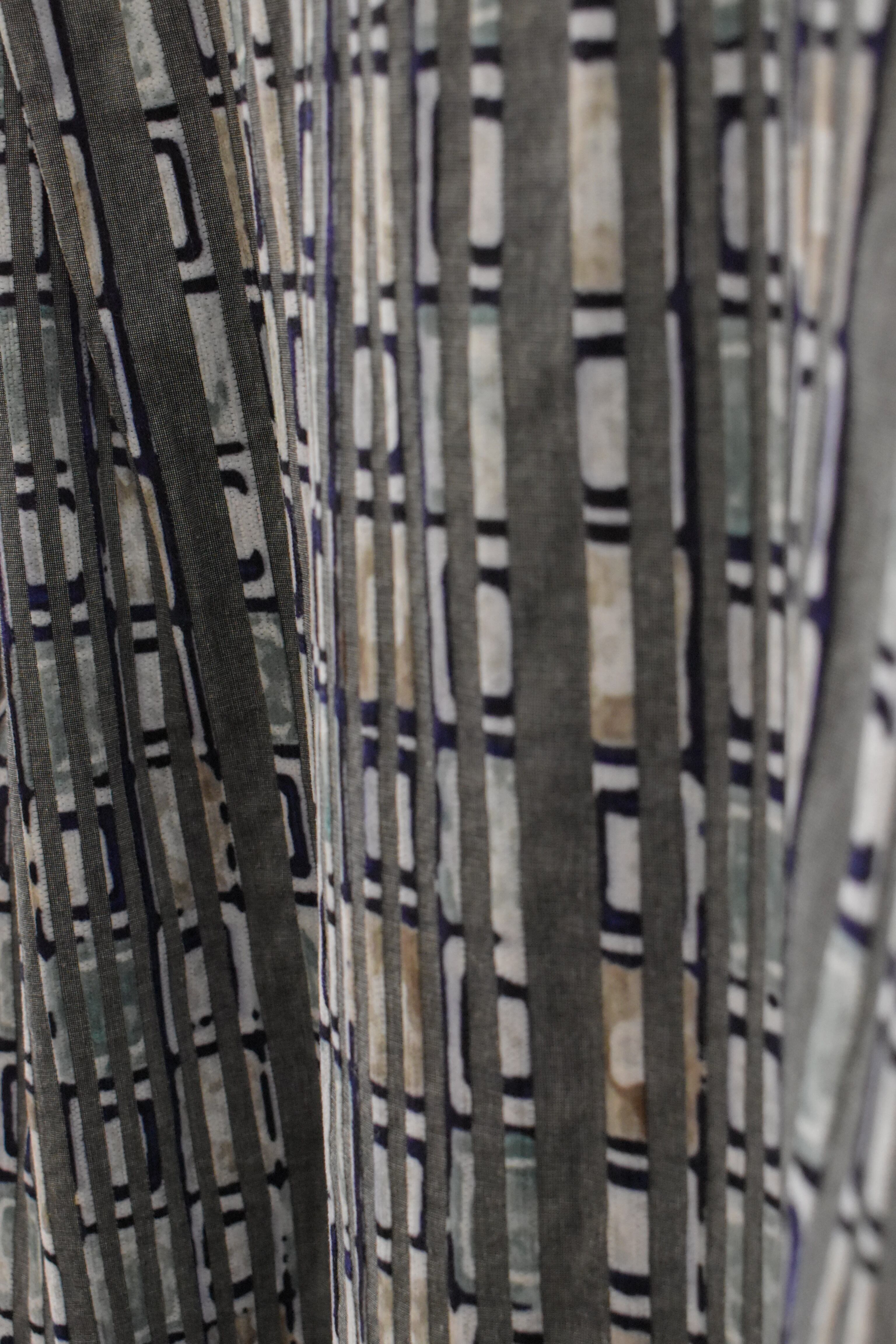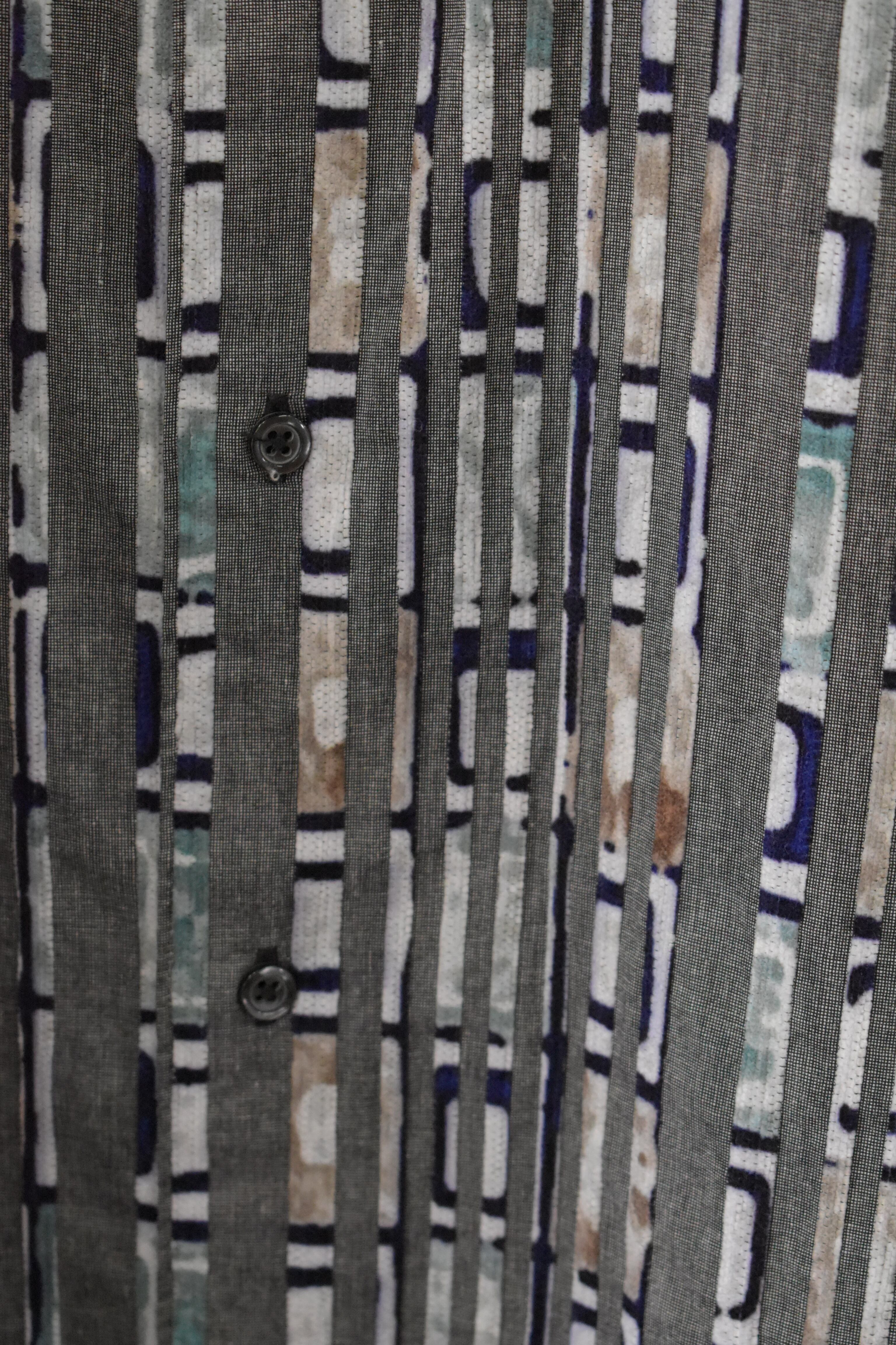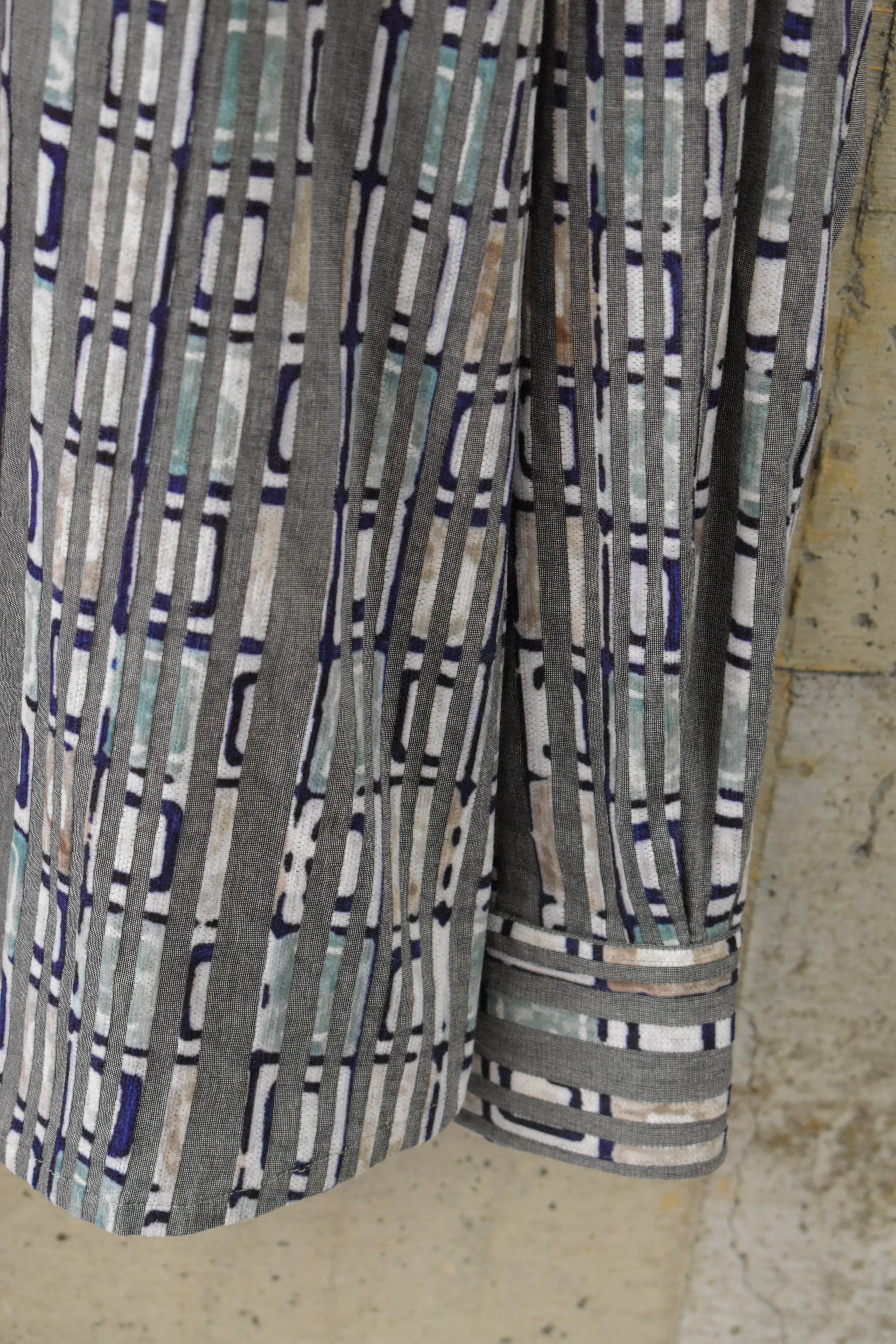 凹凸のあるストライプと、規則的に並ぶ柄が印象的な長袖シャツです。