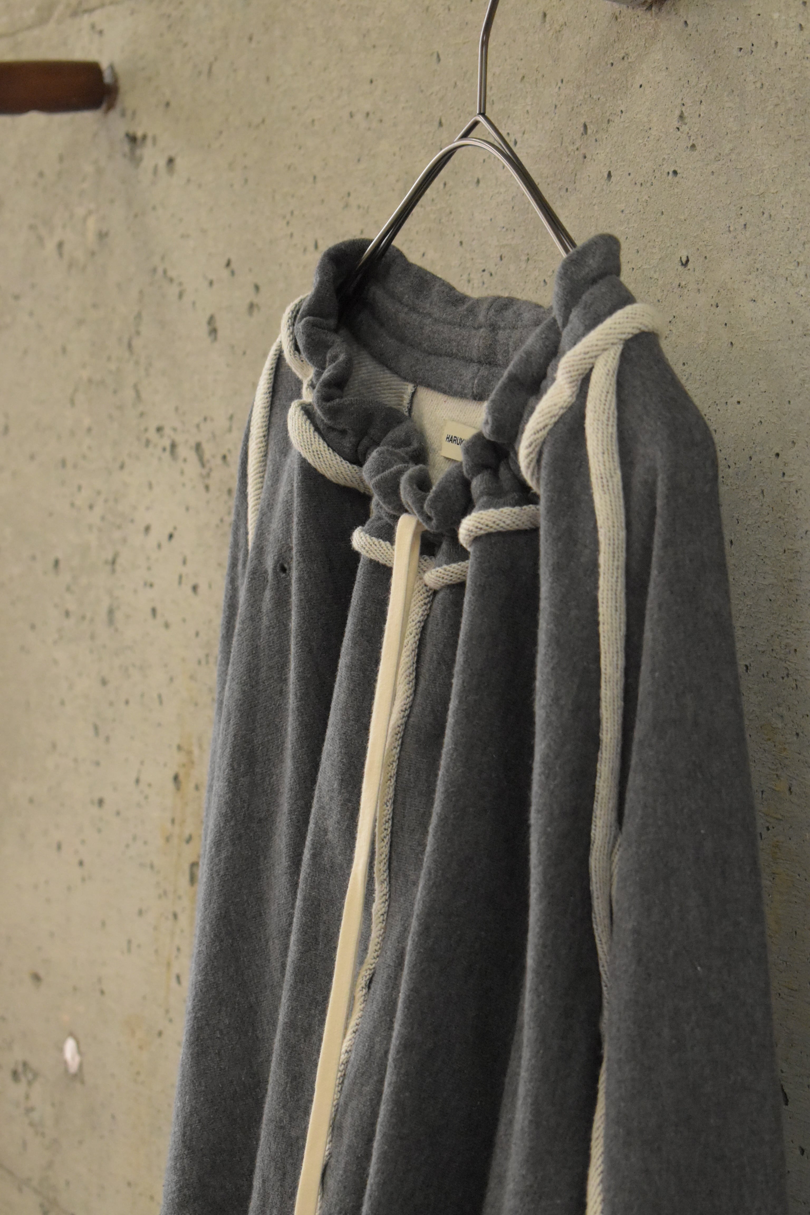 ウエスト部分をネックに配したユニークな構造で、ドローコードによって首元の開き方を調整できます。