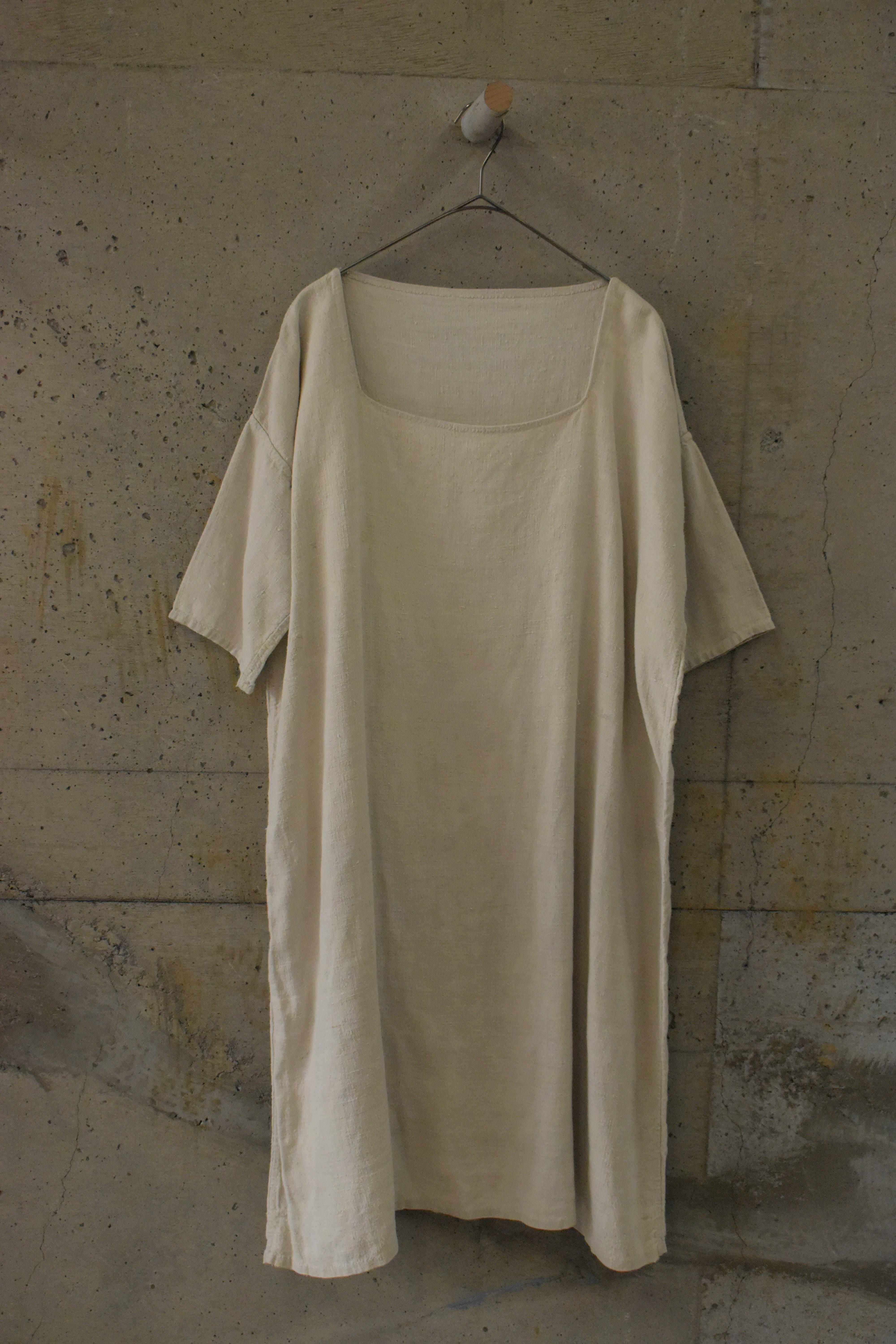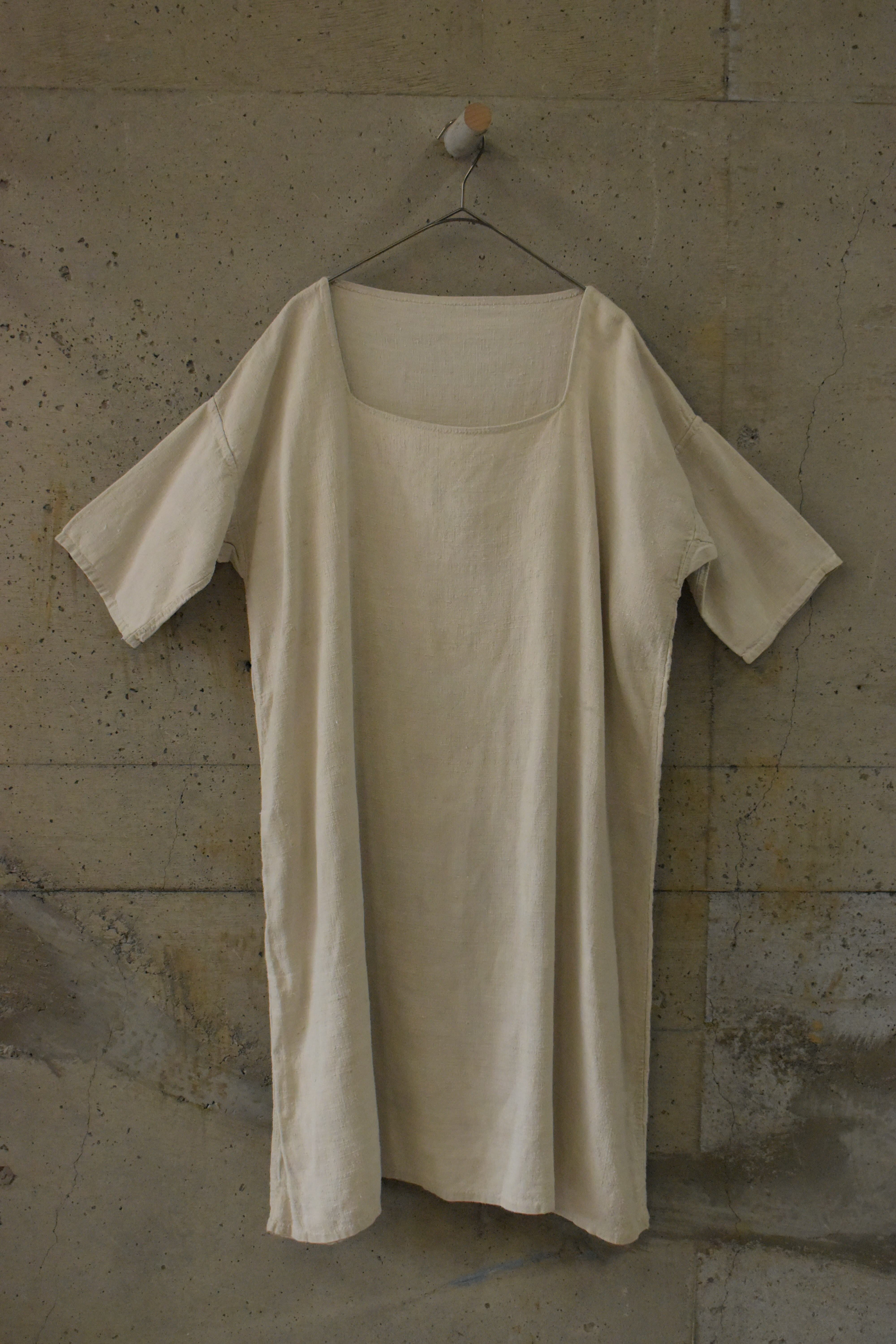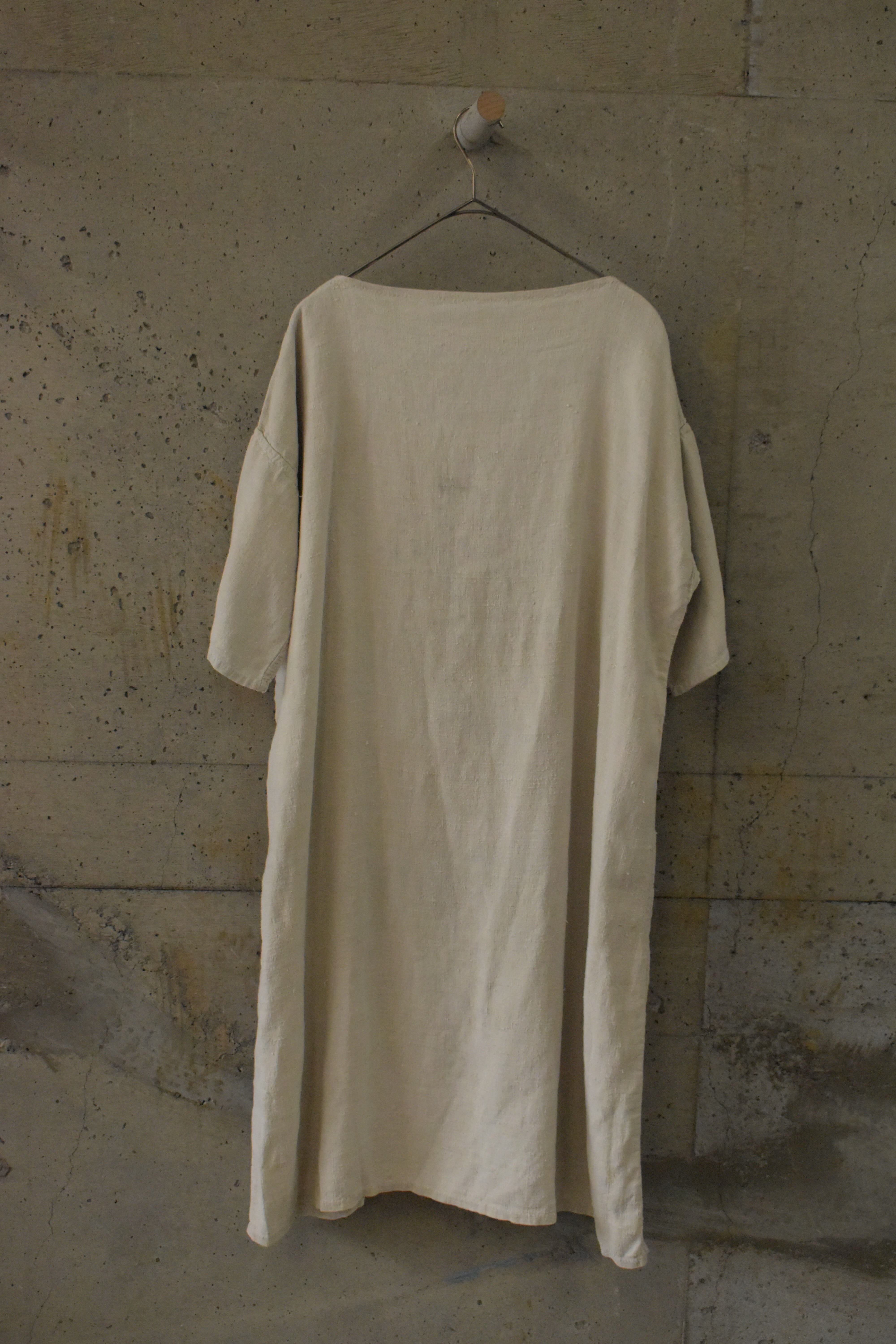コットンやリネンのような、しっかりとした質感の生地に、手縫いの縫製が感じられるワンピースです。